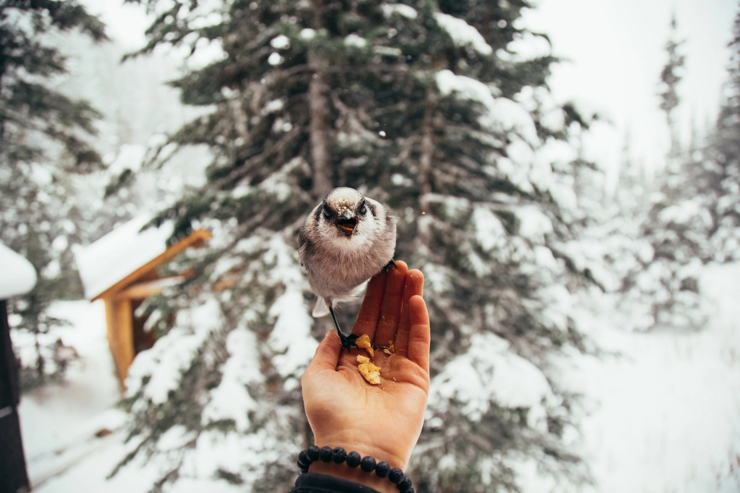 The Alarm rang at a dark and early Seven AM, waking my tired eyes and sore back from sleep for an anticipated sunrise. To which I found no sun whatsoever, and happily went back to sleep for another hour of listening to wind batter the sides of our house. The morning rolled by, wind and snow whipping our faces each time we stepped out the door. Feeding Whiskey Jacks gave us our entertainment and brewing coffee gave us the energy to head home.