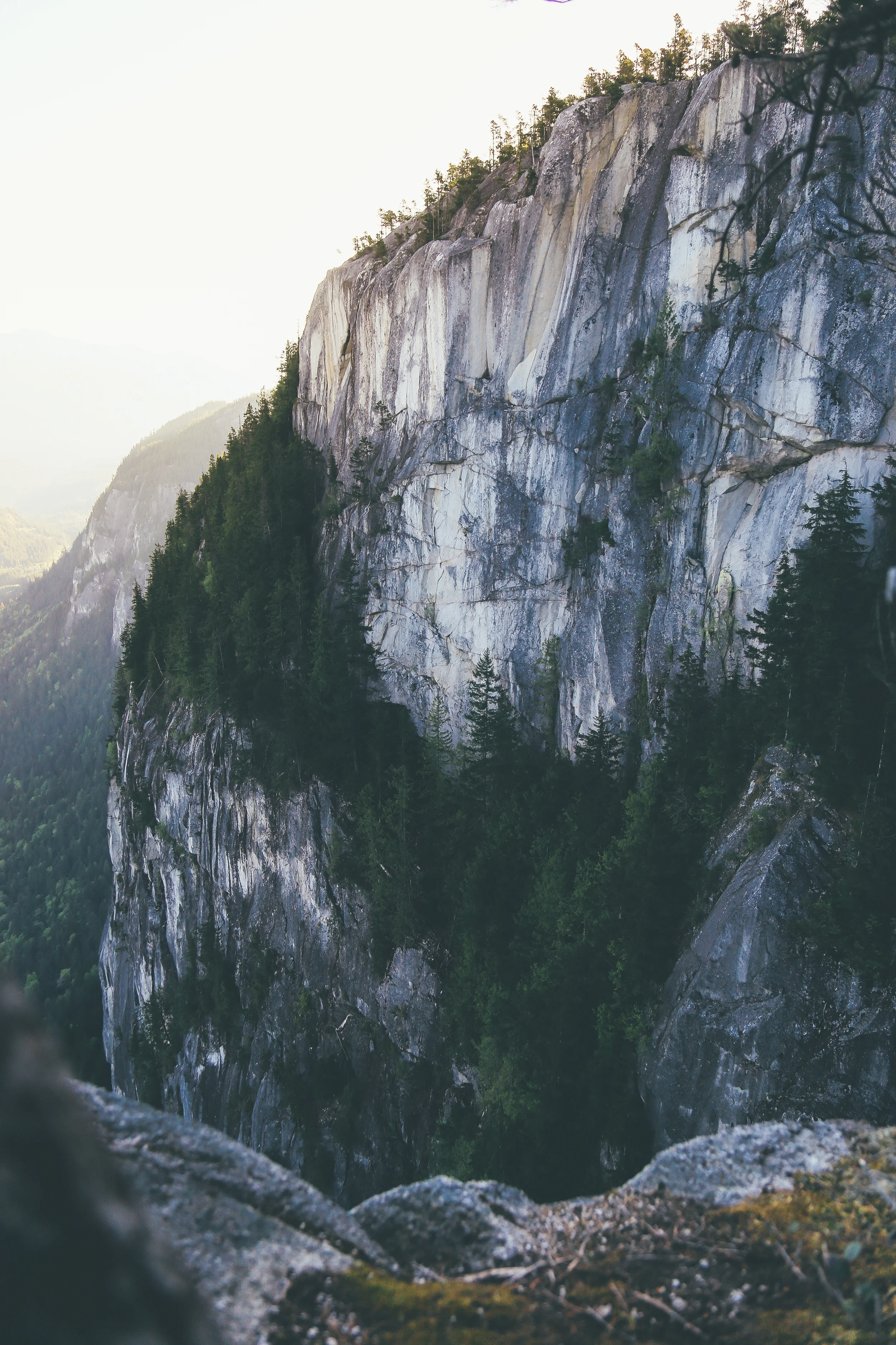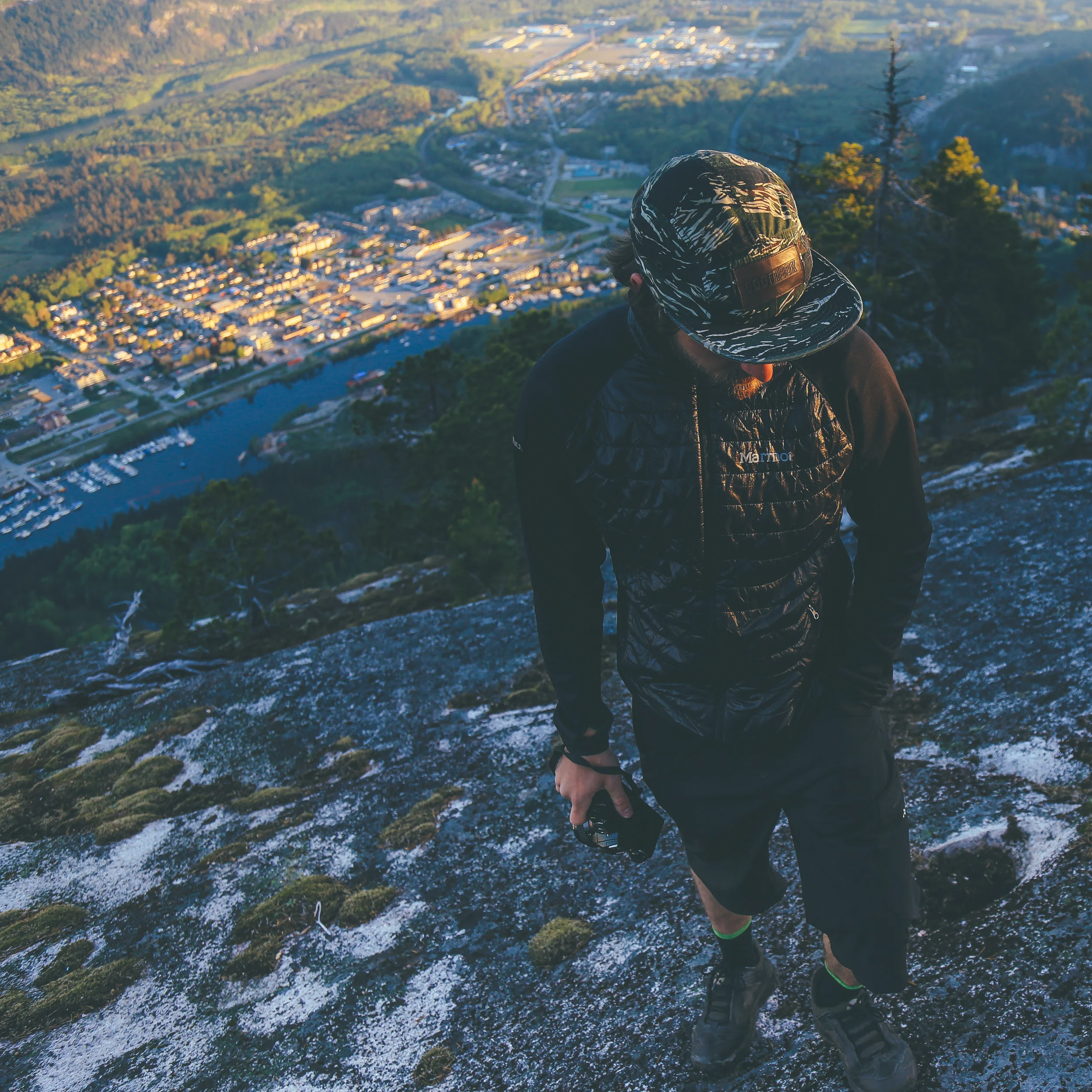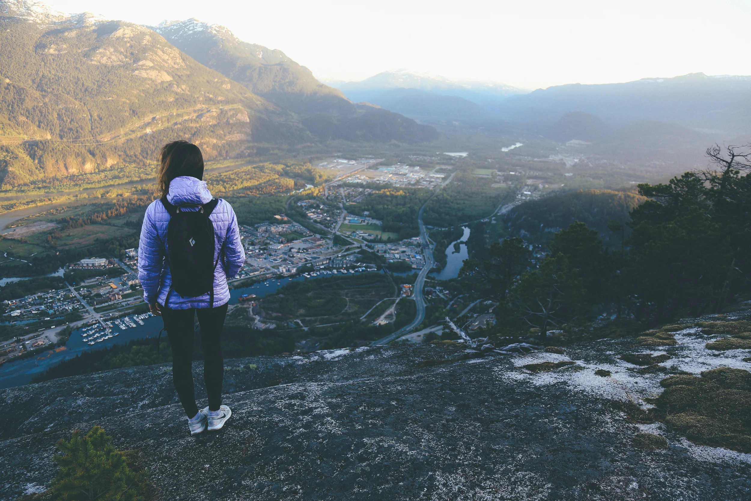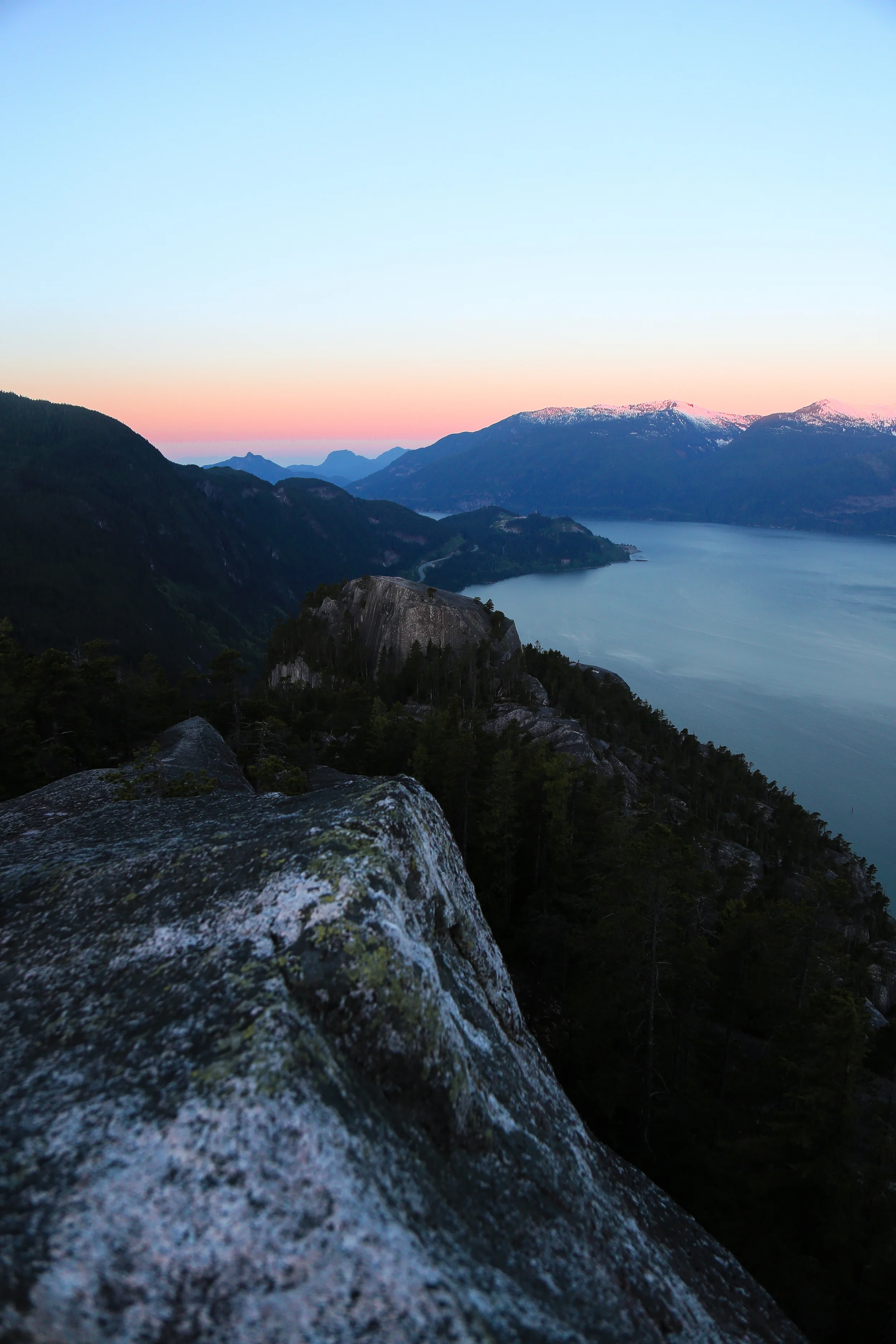 Half way up ( we Guessed ) we stopped, having no visible reference points to tell exactly how close we where to the top. Lost the main trail once. Tripped over the odd root and scrambled up the ladders and rocks. The glow of sunrise hanging in the sky behind us, street lights of Squamish still glowing, roads empty.
