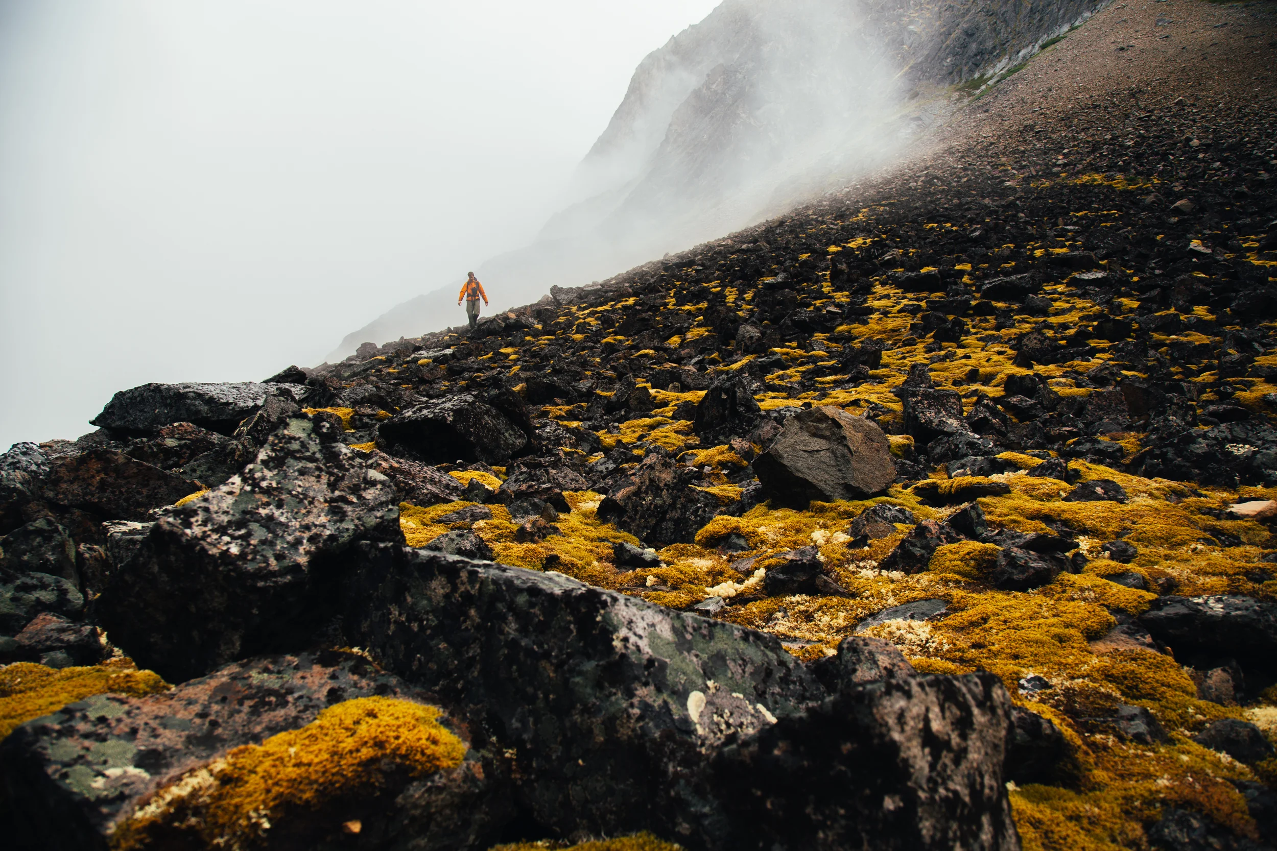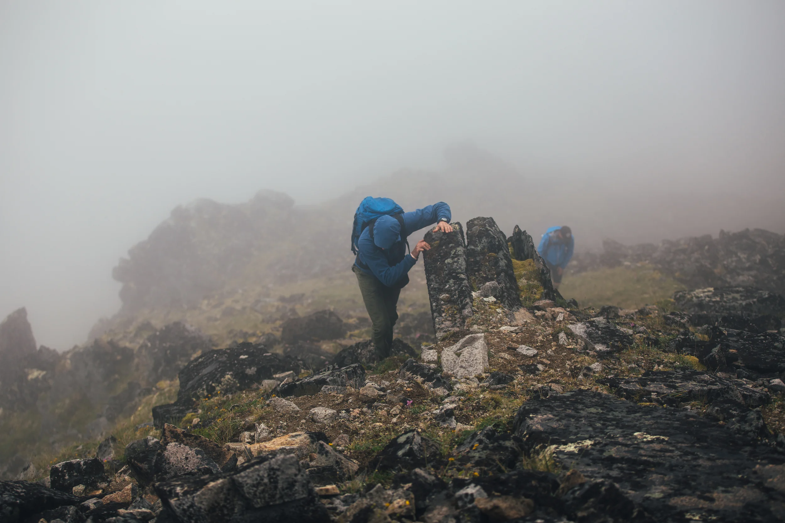 It seems, At least by sheer frequency, that I am a bad luck Charm for weather when hiking. I don't know how or when this started being a thing, But it is. This past weekend Fourteen of us (yes, That many) Decided that summiting one of the biggest leg burning, back breaking mountains in the area was the ideal Sunday activity. We anticipated it to be that big, but after pushing through brush, devils club and up a steep boulder field we were having our doubts. Five hours passed and we had just made it to the ridgeline after a wet and foggy climb up slick grass and loose rock. My hiking poles rendered useless less than half of the way up the mountain. We sat on the ridge, looking over and over at our Map and Gps. Wondering how we got so far back on the ridgeline, We had followed the trail after all. One Kilometre backwards from the peak of Hagwilget, perched on a ledge of unknown height, staring blankly into the white soup that was the cloud hanging onto our little slice of trail heaven, we waited impatiently. "It will pass!" we all repeated, like some half-hearted mantra. Trying to manifest blue skies.
