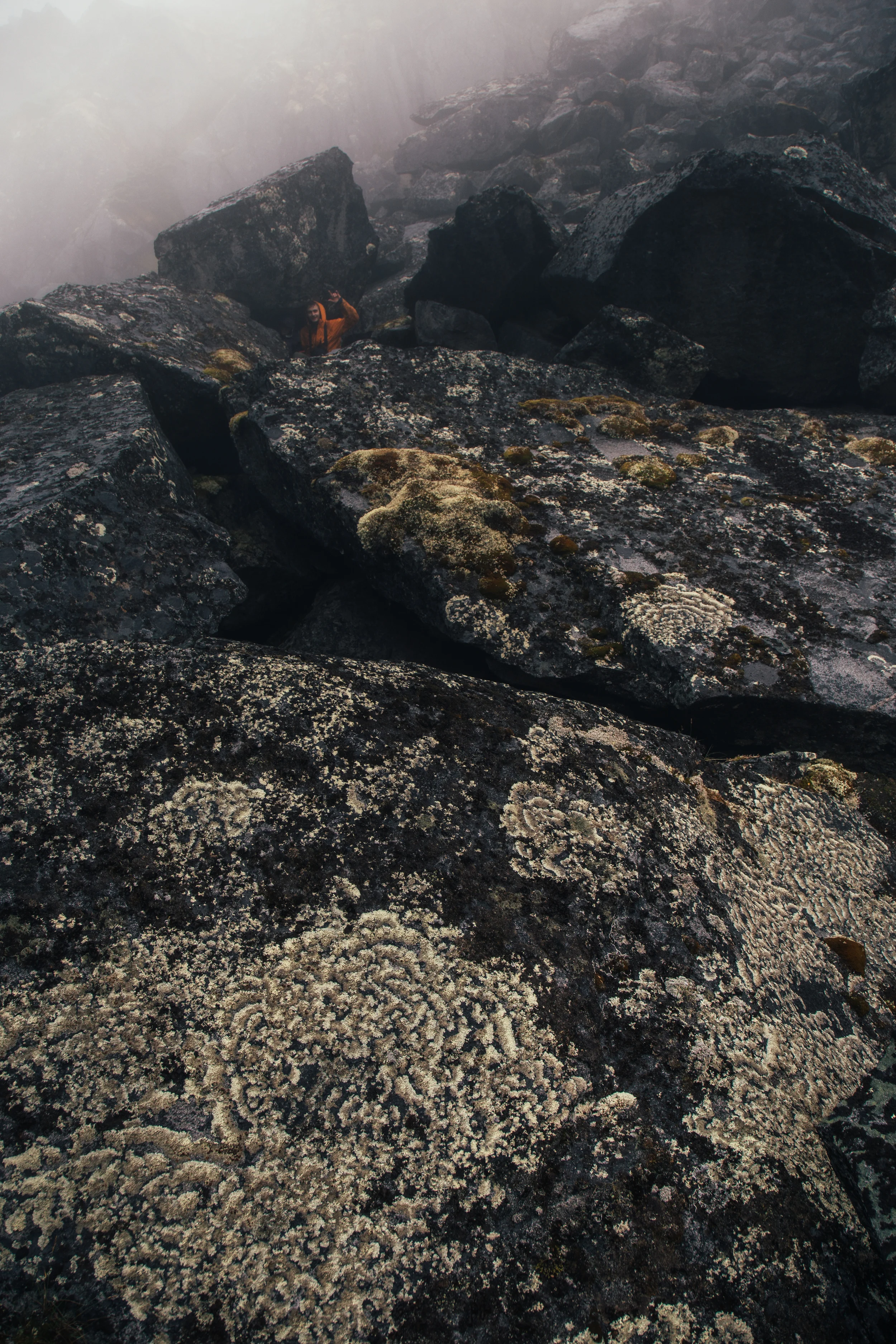 climbing across giant lichen covered boulders, and, hiding from the rain underneath them.